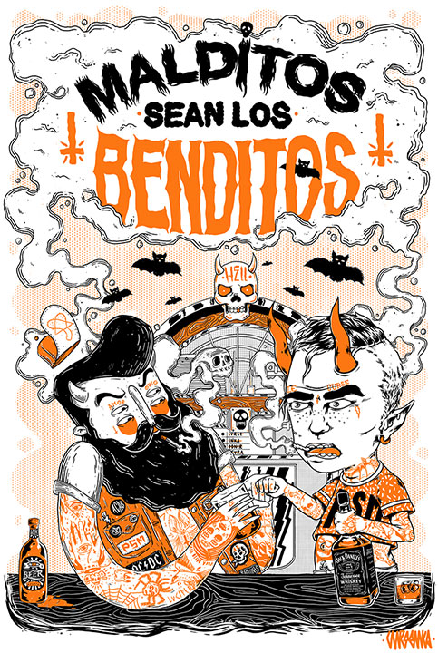 PSM: Después de un tiempo de pensar en cómo sacar a fluir este proyecto, y un poco solitario, puesto que por otros proyectos PSM pasó a ser sólo uno un tiempo, Curse saca un pequeño fanzine llamado "PÓRTATE SIEMPRE MAL", en el cual reune varios ilustradores de Bogotá. Uno de ellos es Enka el que después de un tiempo y de parchar mucho se une a PSM siendo ahora, Curse y Enka. Viendo de esta forma que le queríamos tirar a la ilustración y todo este mundo, decidimos convertir PSM en un estudio creativo, dedicado primordialmente a la ilustración. Ahí sacamos un primer proyecto como estudio, el cual es "Malditos sean los benditos", en los que salen carteles, packs de calcas y material promocional del estudio, con el fin de dar a conocer lo que se estaba armando.