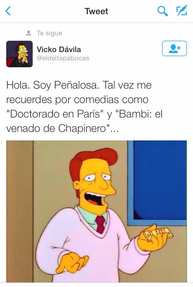 Hace algunos días en Facebook vi un meme que me hizo reir bastante y que de inmediato supe le daría nombre a una futura columna. Columna que no pude dilatar más debido a las circunstancias: descaro político en su máxima expresión. En el meme aparecía el actor peliculero de Los Simpsons Rainier Wolfcastle diciendo algo como: “Hola, soy Peñalosa. Tal vez me recuerdes por comedias como ‘Doctorado en París’ y ‘Bambi, el venado de Chapinero’”. En días no he visto un meme tan bueno como ese.