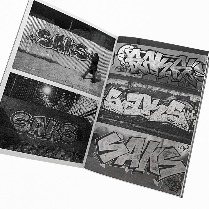 El sólo hecho de la aparición de este material, aún antes de conocer el contenido de la publicación, me parecía ya importante. Que un escritor de graffiti de la talla de Saks hubiera decidido hacer una revisión de su trabajo para sacar un impreso es relevante para este momento de la escena en el que está llegando mucha gente nueva y al parecer todo se mueve de forma vertiginosa. Un momento en el que, desde mi punto de vista, se debería estar mirando y abordando, de forma importante y seria, la documentación.